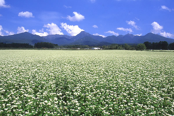 八ヶ岳原村中央高原の広大なそば畑。八ヶ岳連峰をバックに、白いそばの花が初秋の風に揺れています。※栽培をしない年があり。撮影等の場合は、事前にお問い合わせを。 問/0551-36-646