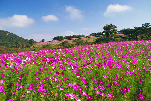 標高1200m、放牧地であった丘陵3ha一面に咲くコスモス。 100万本ものコスモスのお花畑には遊歩道も整備され、 観光名所となっています。入園無料。