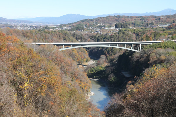 三遠南信自動車道の天龍峡ICと千代ICの間に架かる全長2801m、高さ約82mの大橋。高速道の下に歩道「そらさんぽ天竜峡」が設けられ、眼下に天竜川を渡る飯田線ローカル列車や川下りなど、四季折々の景色が楽しめます。