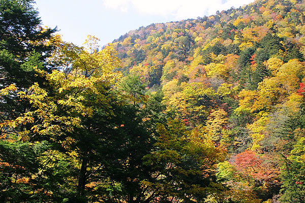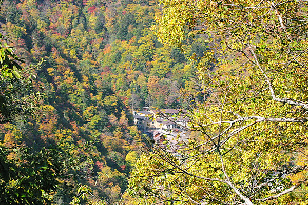 白骨温泉を取り囲む山々、渓谷の息を呑むような見事な紅葉。 |