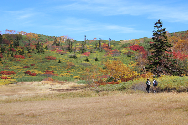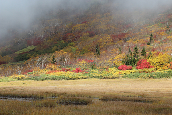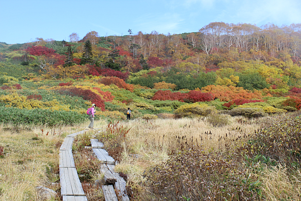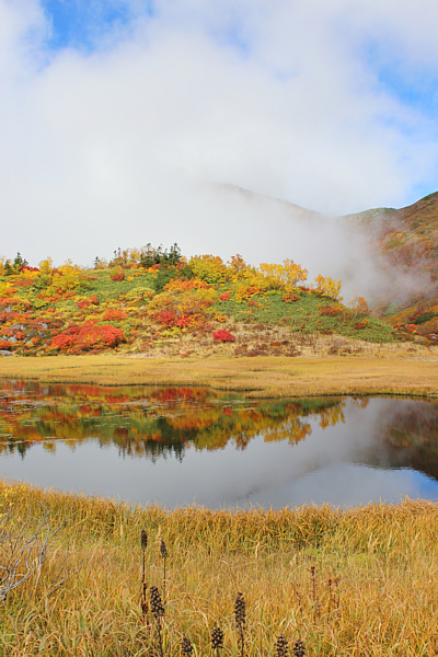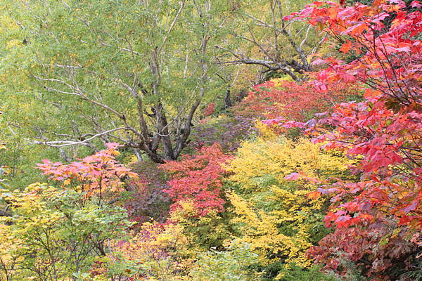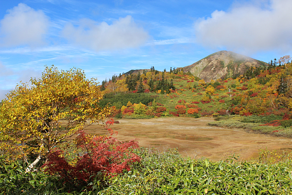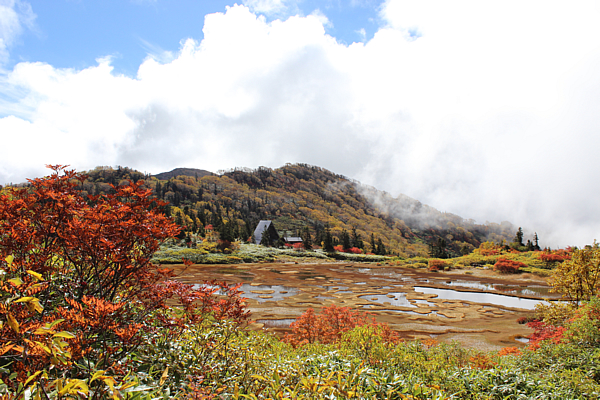 【火打山】 上信国境(新潟県と長野県の県境)頸城アルプスの最高峰・火打山は、登山口である 妙高高原などからはその姿を見ることが出来ない、神秘的なイメージを抱かせる美しい山。 紅葉の季節には、ナナカマドやダケカンバの見事な紅葉が山肌を覆い、まさに雲上の薬園の趣です。 妙高高原笹ヶ峰より天狗の庭まで約3時間30分の登り。 問/妙高高原町観光協会 ・0255-86-3911 (紅葉の見頃 9月下旬〜10月中旬) 紅葉状況