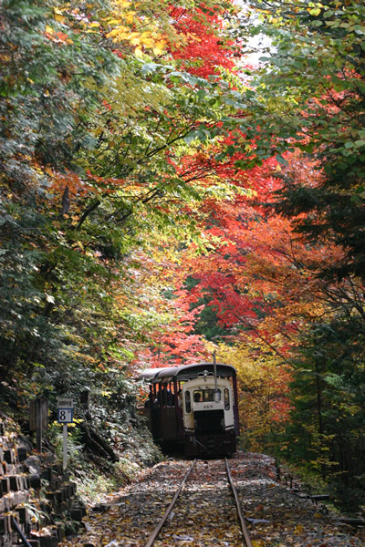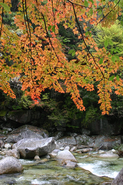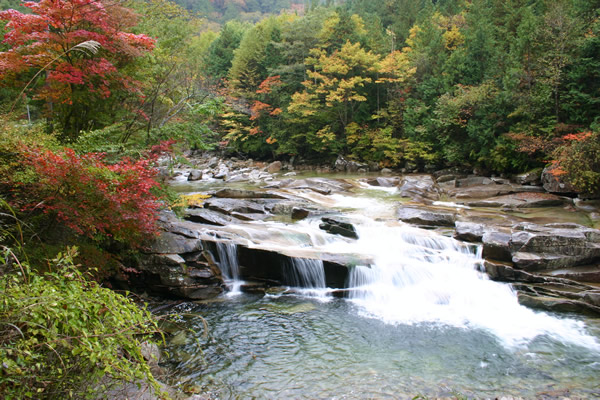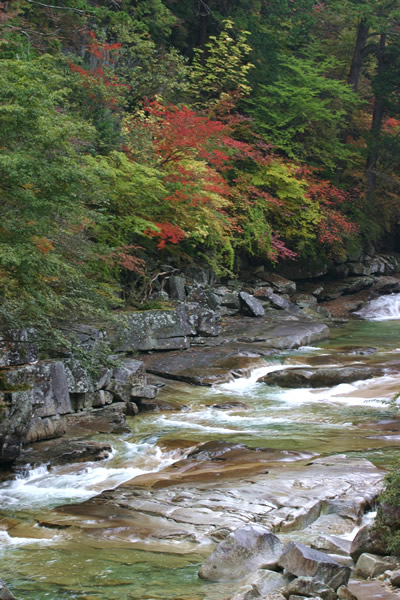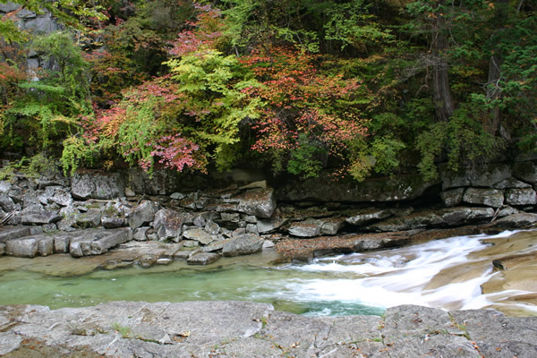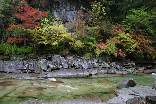 色とりどりの紅葉が約10kmにも及ぶ美しい渓谷を鮮やかに彩ります。