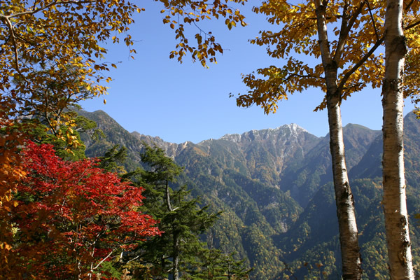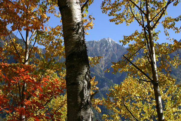 紅葉の秋には、アルプスを背景にしたスケールの大きな風景写真が撮影できます。