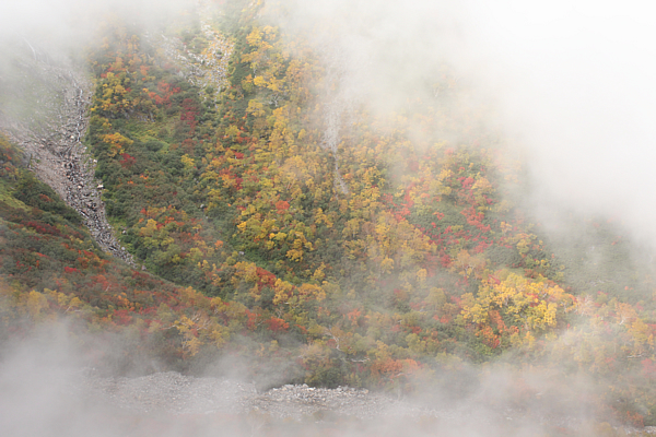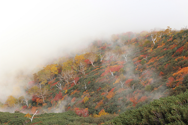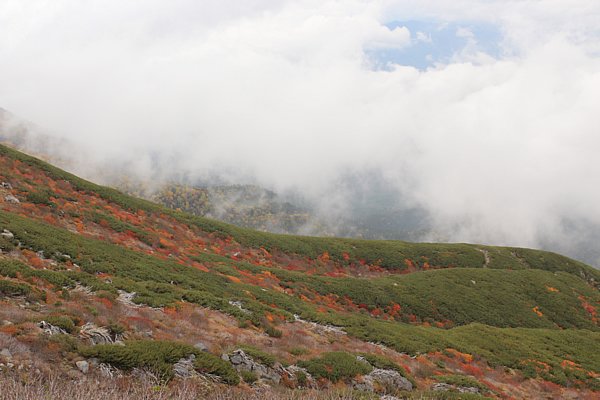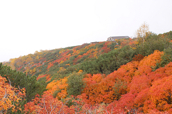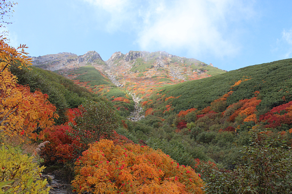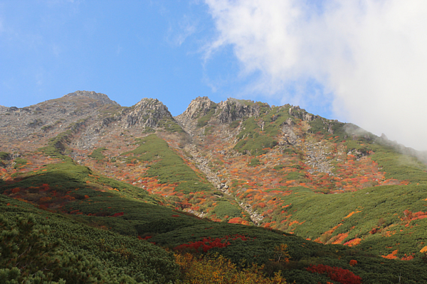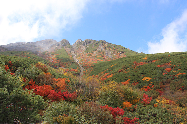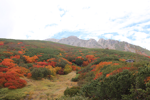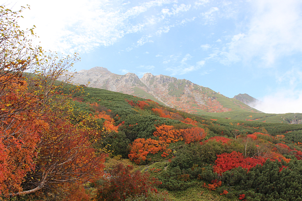緑のハイマツの山肌を真紅に染めるナナカマドの紅葉が圧巻です。
