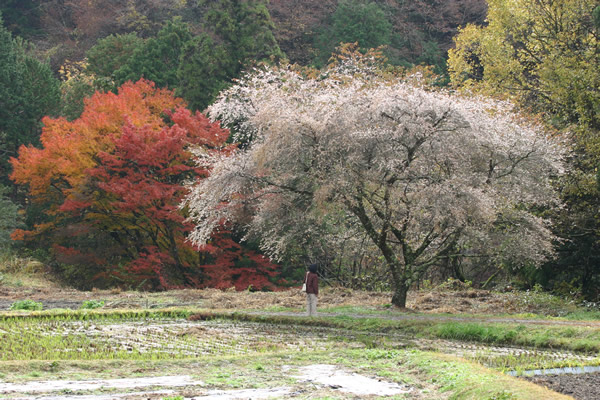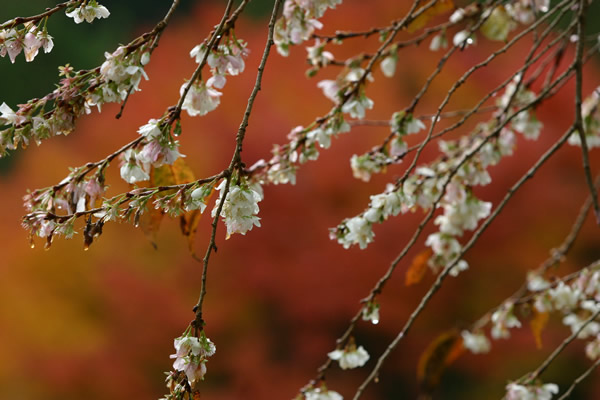 紅葉と桜の花の不思議な競演が訪れる人の目を楽しませてくれます。