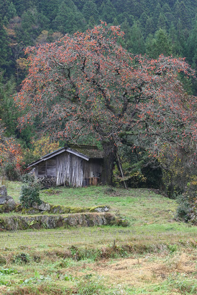 紅葉が見頃となる時期、黒地地区では春と秋に花を咲かせる一本の四季桜が満開となり、