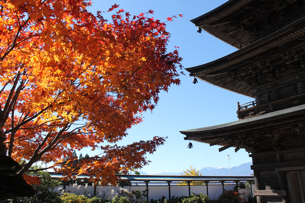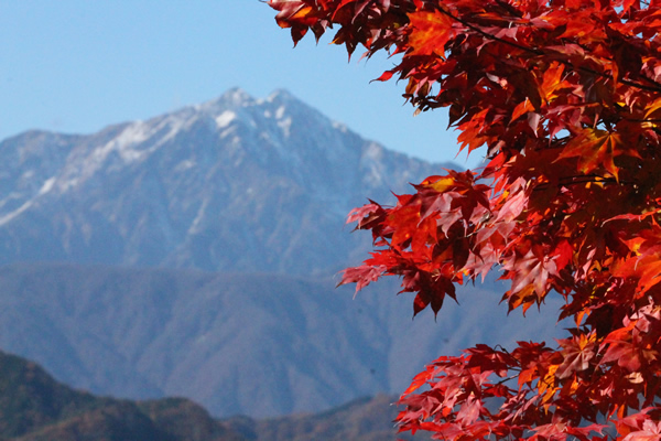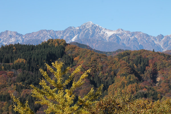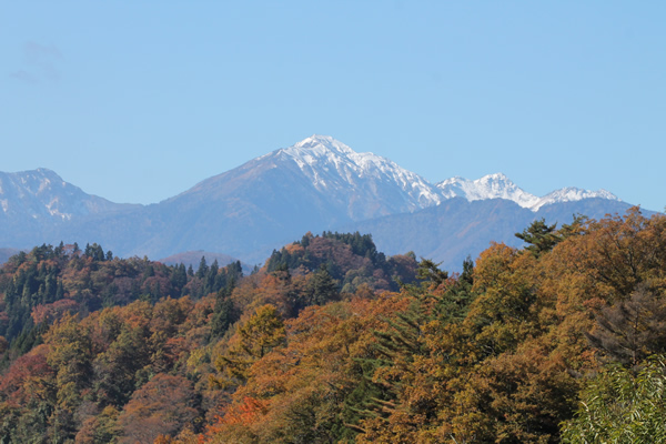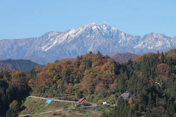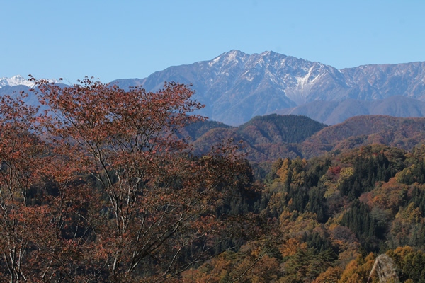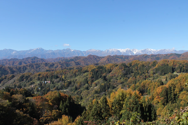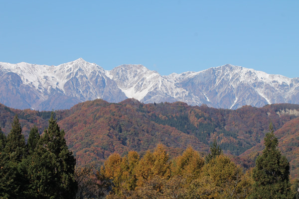 小川アルプスライン(県道36号)は、紅葉の里山の向こうに新雪の北アルプスの稜線が連なる絶景の地。