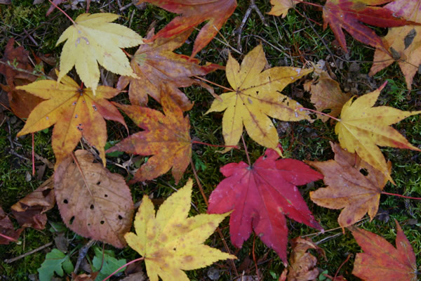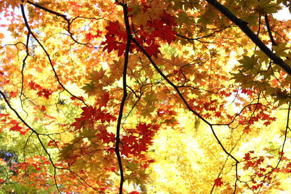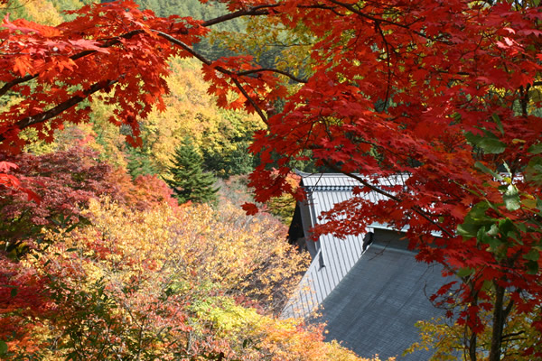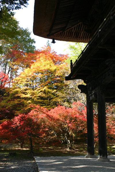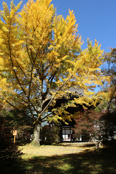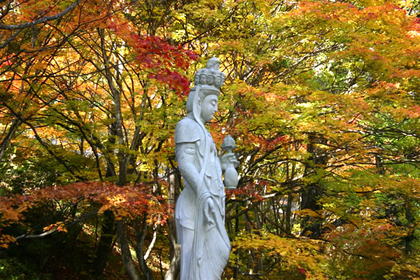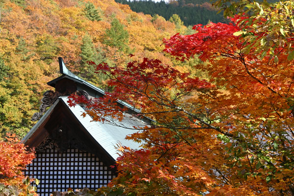 モミジやドウダンツツジ、オハツキイチョウの赤や黄色の彩りで境内が埋め尽くされます。