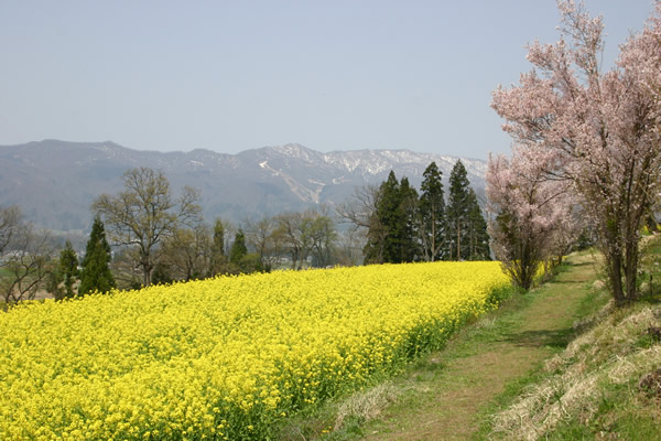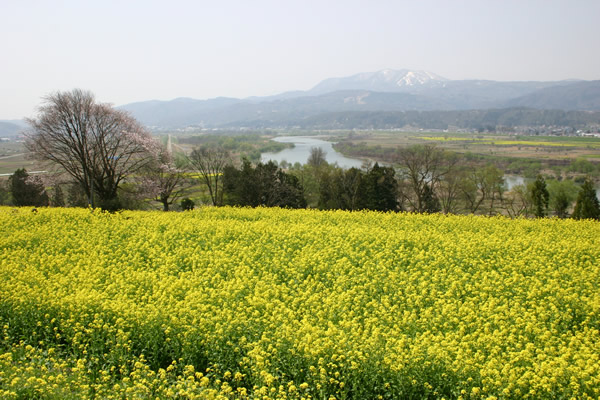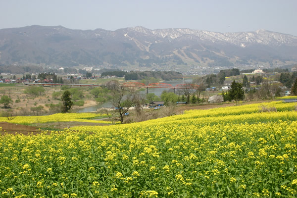 野沢温泉の近くの千曲川のほとりにある菜の花公園は、まるで一帯に黄色い絨毯を敷きつめたかのような 菜の花の大群落が。菜の花と千曲川と残雪の斑尾山。童謡が聞こえてきそうなのどかな風景が広がります。