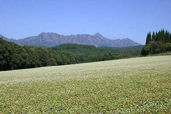 戸隠連峰とそばの花 (戸隠高原・戸隠展望苑 8月下旬〜9月中旬) 堂々たる山容の戸隠連峰をバックにそば畑が広がる戸隠高原展望苑は、 カメラマンに人気の絶景スポット。