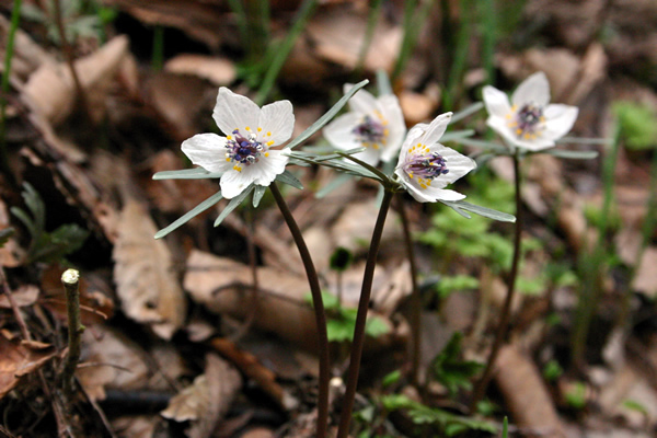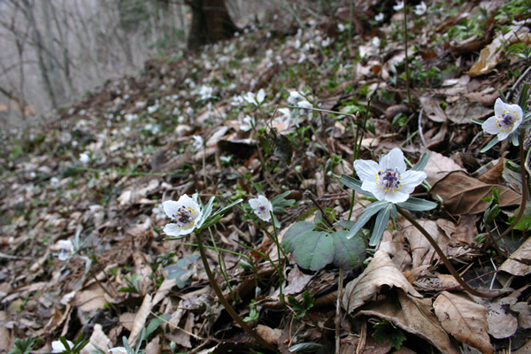山地での開花は3月上旬。花茎の先に2センチほどの白色の花をつけるが、花弁に見えるのは実は萼片。