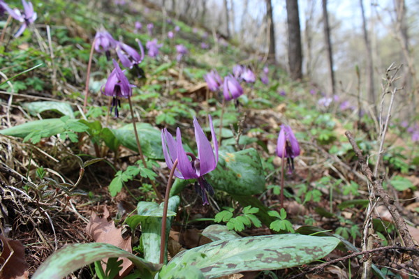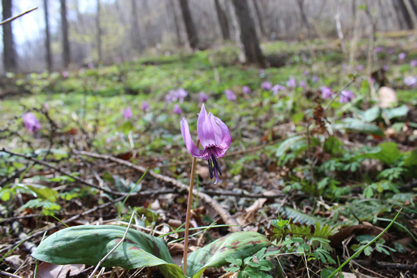 曽原のカタクリ (長野県佐久穂町 4月中旬〜下旬) 八ヶ岳山麓佐久穂町曽原の町有林内約4haに広く群生するカタクリ。 4月中〜下旬、山の斜面一面に紅紫色の花を咲かせます。