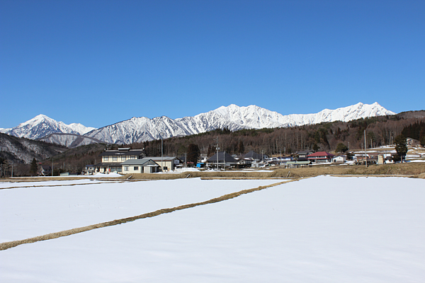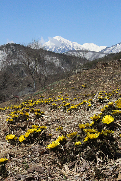 北アルプスと福寿草 (大町市美麻新行高原 3月中旬〜4月上旬) 北アルプスの白き峰々がくっきりとその姿を現す、大町市郊外の美麻新行高原。 残雪の中、のどかな村内のあちこちに福寿草が開花、高原に春の訪れを告げます。