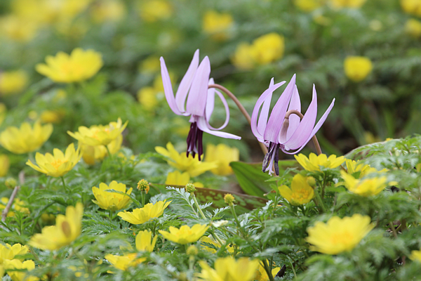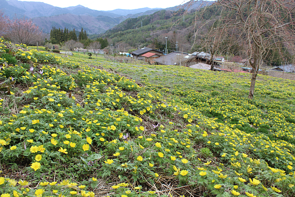 大桑村伊奈川の福寿草の群生 (長野県木曽郡大桑村伊奈川 3月下旬〜4月中旬) 木曽路大桑村、中央アルプスより流れ出る伊奈川の清流。この渓谷を遡る所に位置する大野地区。 鄙びた雰囲気の地区内の丘陵地一面に咲き乱れる、見事な福寿草の群生。その壮観な風景に圧倒されます。 (※この群生地は、個人のお宅(山本さん、中家さん)の敷地内にあります。 畑などを踏み荒らすことのないよう、マナーを守って花の観賞を楽しんで下さい。)