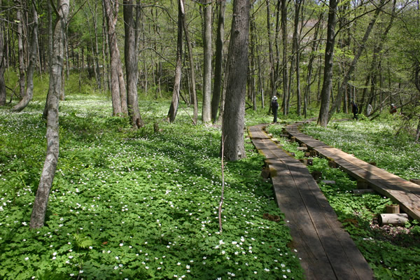 林の中一面に咲き誇る、白く可憐なニリンソウの群生をご覧頂けます。