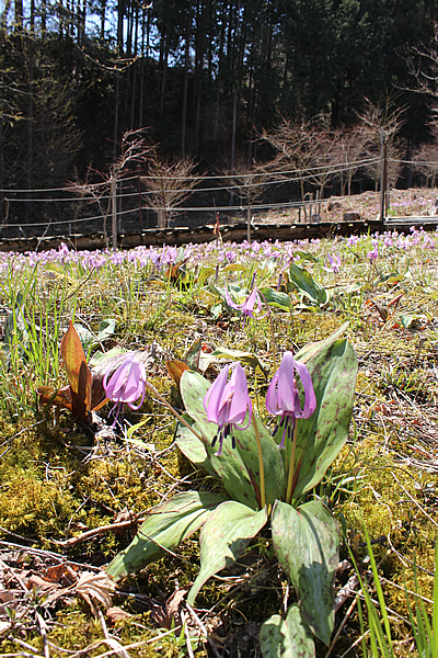 かたくりの里 (飯田市大瀬木) (南信州飯田市 4月上旬〜下旬) 南アルプスを望む高台、飯田市大瀬木梅ケ久保の「かたくりの里」は、 のどかな山間のせせらぎ沿いに自生する約1ヘクタールの群生地。 地元の住民の皆さんの「梅ケ久保自然愛護会」が手入れ、保護しています。