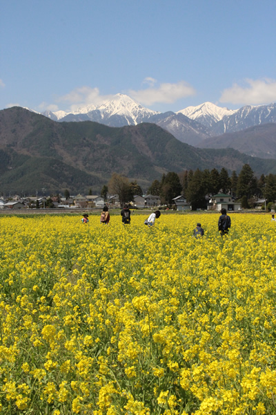 北アルプス常念岳と菜の花畑 (安曇野市 4月中旬〜下旬) 安曇野のシンボル北アルプス常念岳を望む、堀金物産センター隣りに広がる菜の花畑。 黄色の絨毯、残雪の北アルプス、紺碧の空のコントラストが爽やかです。