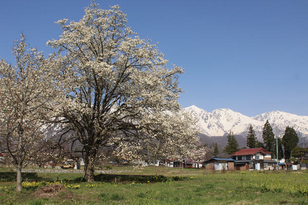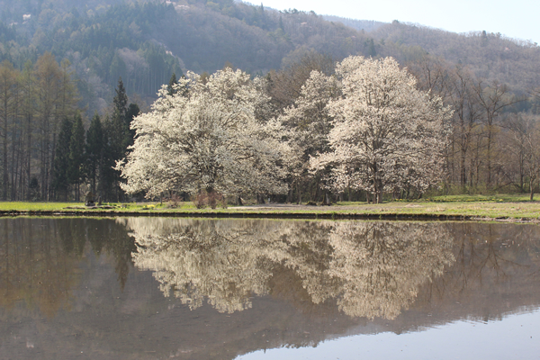 四十九院のコブシ (白馬村 4月下旬〜5月上旬) 白馬山麓にひと足早く春の訪れを告げるコブシの花。 白馬村では田んぼの脇や里山のあちこちでその白い花を見かけます。 中でも四十九院(しじゅうくいん)のこぶしは、 水をはった田んぼの脇にひときわりっぱなコブシが2本並んで佇み、 その水に映った姿も美しく、春の人気の撮影スポットとなっています。
