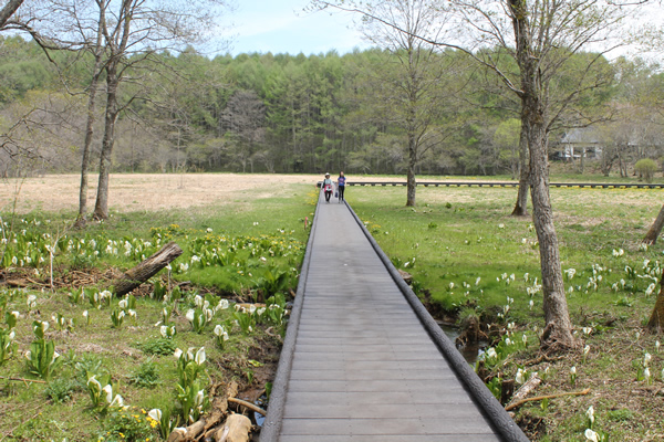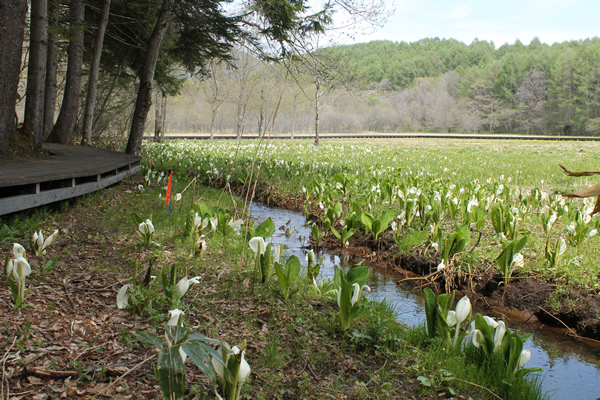 大谷地湿原・水ばしょう (長野市飯綱高原 5月上旬〜中旬) 長野市から戸隠に伸びる戸隠バードライン沿い、飯綱高原の大谷地湿原に群生する、 白く可憐なミズバショウ。同時期にはニリンソウやリュウキンカの群生も見られます。 一周約30分の閑静な遊歩道を巡り、花の湿原が楽しめます。