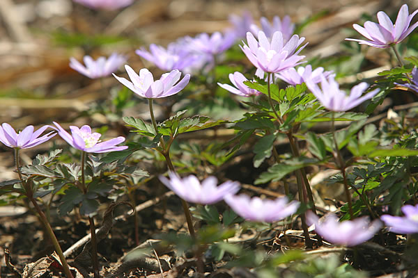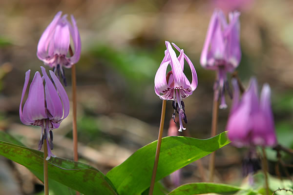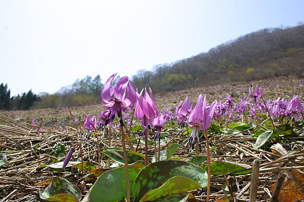 白馬五竜 かたくりの花群生 (白馬村神城 4月下旬〜5月上旬) 白馬山麓、白馬五竜スキー場サイドの一角、日当たりの良い山の斜面に広がる花園。 毎年5月連休頃にカタクリの可憐な花の群生が見られます。同時期にはキクザキイチリンソウや ニリンソウ、コブシの花が開花。まさに百花繚乱、野の花の競演が楽しめます。