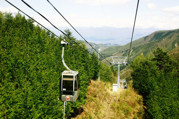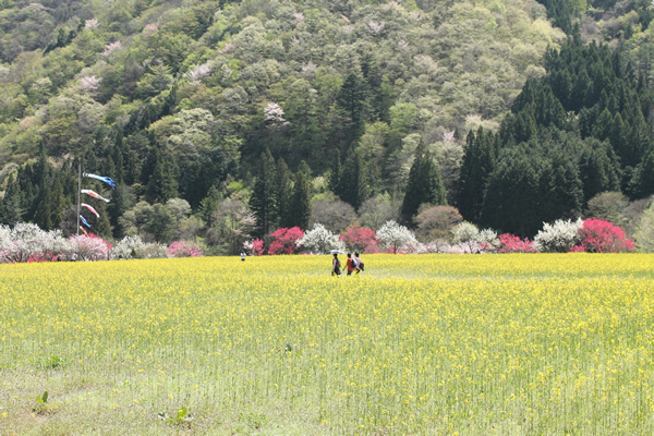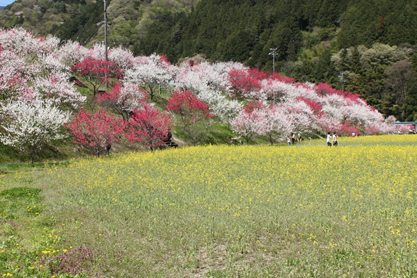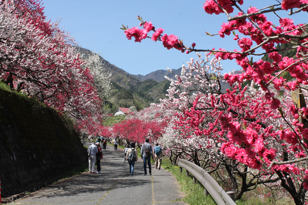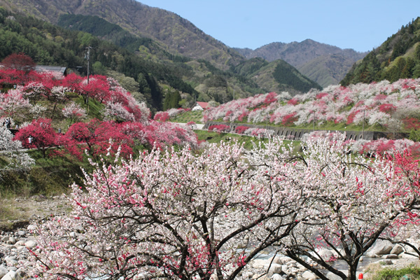 春は4月下旬、南信州阿智村昼神温泉郷近くの山あい、園原月川温泉郷の「花桃の里」には5000余本もの赤、白、 ピンクの花桃が咲き競います。新緑の中に点在する花桃は鮮やかに山里を彩り、その風景はまさに桃源郷の趣。
