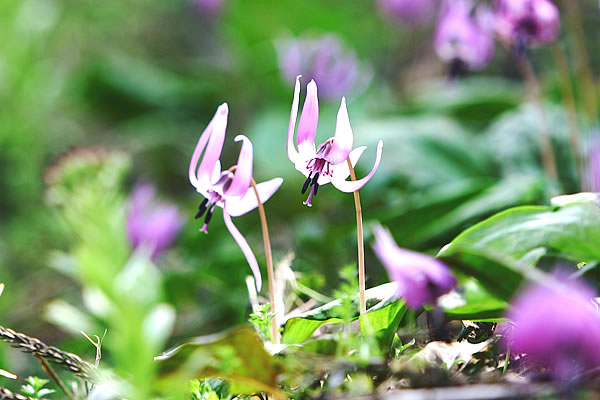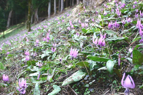 松本市波田上海渡 かたくり園 (4月中旬〜下旬) 松本市郊外波田町の里山にあるかたくり園。地元の人々が守り、 大切に育てた可憐なかたくりの花の群生が見られます。4000平方メートルの園内には、 約3万株のカタクリの他、ニリンソウやアズマイチゲ、キンバイソウなど 約20種類の山野草も見ることができます。
