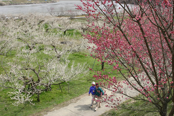 竜峡小梅の園 (信州新町ろうかく梅園 3月下旬〜4月上旬) 長野市郊外、信州新町の「ろうかく梅園」には 約500本もの竜峡小梅が。開花時には、梅の花の香りに包まれて のんびり信州の春を楽しむ人々で賑わいます。
