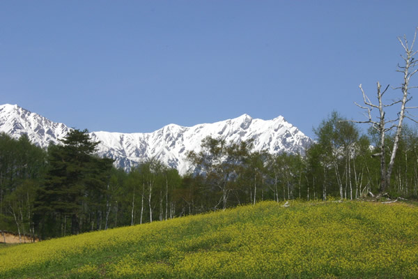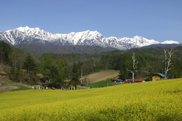 大町市郊外美麻の中山高原には、地元の菜の花生産組合が栽培する菜の花畑が拡がり、一面黄色の絨毯の向こうには残雪の鹿島槍ヶ岳、爺ヶ岳、蓮華岳、五竜岳が聳え、写真愛好家の絶好の撮影スポットになっています。問/大町市美麻支所産業建設課 Tel:0261-29-2311