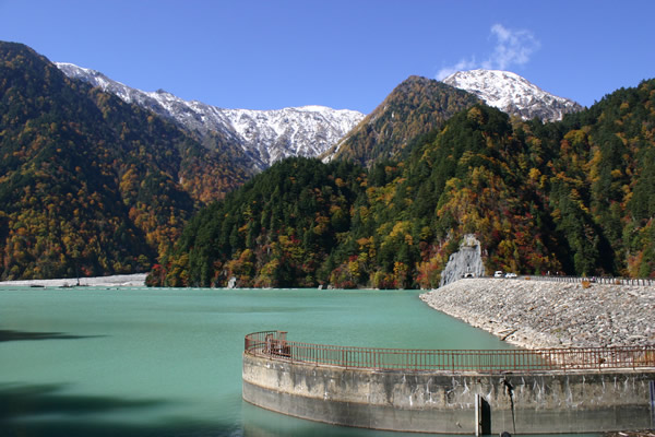 北アルプス槍ヶ岳の登山口でもある大町市の高瀬渓谷。 エメラルドグリーンの高瀬ダムや山岳風景などを背景に、