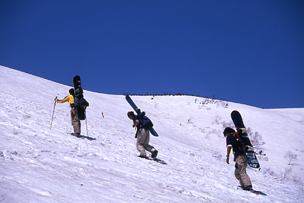 天狗原より白馬乗鞍岳東大斜面を登る。 |  |