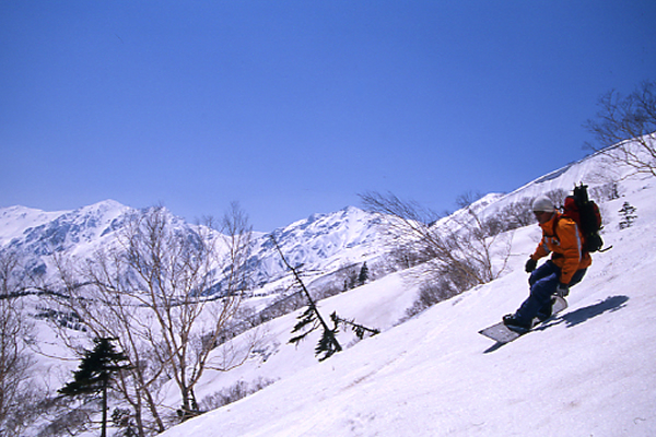 | 北アルプスの真っ只中を軽快に滑り下りる。
