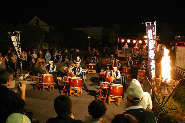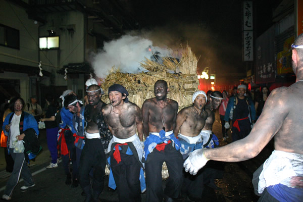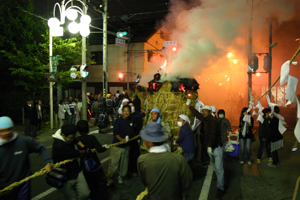 日本三大奇祭の一つとされている、松本市郊外浅間温泉御射神社秋の例祭。五穀豊穣と人々の安泰を願い里の秋宮におられた氏神様が、採り入れ後の麦わらでつくったたいまつの煙に乗って、4Kmほど奥の御射神社春宮に帰られるという奉納行事。温泉街の入口から御射神社までの1,5kmを火焔太鼓を先頭に大小約50本ものたいまつが温泉街を練り歩き、最後には御射神社に奉納されます。