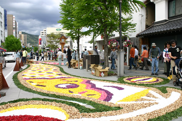 毎年5月連休に開催される、長野市善光寺表参道を彩る花のフェスタ。 チューリップ の花びら使った花の地上絵、ペチュニア等のポットを使った地上絵などが見られ、訪れた観光客の目を楽しませています。問/善光寺花回廊実行委員会 TEL:026-214-2566