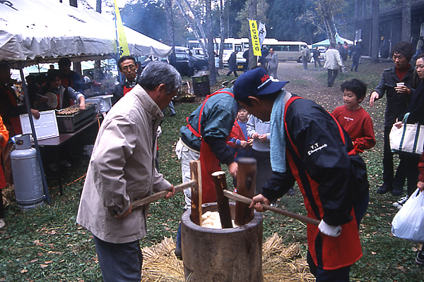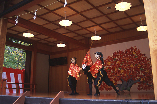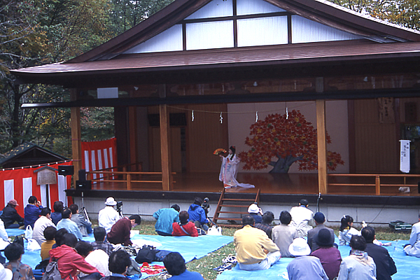 都から信濃の深い山に流された美女が鬼女となり、平維茂(たいらのこれもち)に成敗される「鬼女紅葉」の物語。その舞台である戸隠と、山を隔てて隣り合う鬼無里には、「鬼女紅葉」の伝説やゆかりの場所が語り伝えられています。「鬼女紅葉祭り」は鬼女紅葉を偲んで開かれるお祭り。紅葉が美しい荒倉キャンプ場周辺で行われ、紅葉稲荷神社(前宮)で荒倉山に向かって行われる神事から始まり、能舞台では獅子神楽や謡曲、舞踊などが披露されます。能舞台の周辺には、おやき・もみじそば・振る舞い酒などの売店が設けられ、賑わいます。