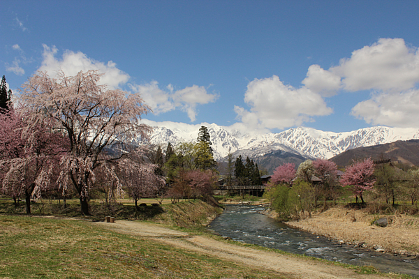 白馬村姫川沿いの大出公園は、北アルプス白馬連峰と吊り橋、茅葺きの家をアングルに収める、カメラマンに人気の絶景スポット。5月連休時には、眩いばかりの残雪の白馬連峰をバックに、姫川に架かる吊り橋と桜の風景を撮影することができます。
