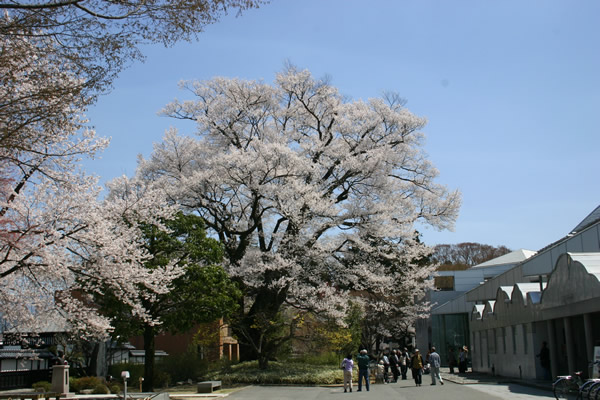飯田市美術博物館の庭にある県指定天然記念物でもある古木の名桜。樹齢約450年のエドヒガンザクラ。