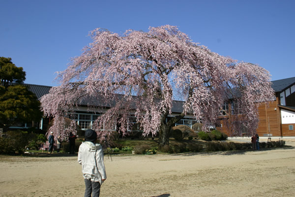飯田市山本杵原、旧山本中学校の校舎前にあるシダレザクラ。この校舎で松竹映画「母(かぁ)べえ」のロケが行われた。古い校舎と桜の木が、懐かしい、レトロな風景を作りだしています。