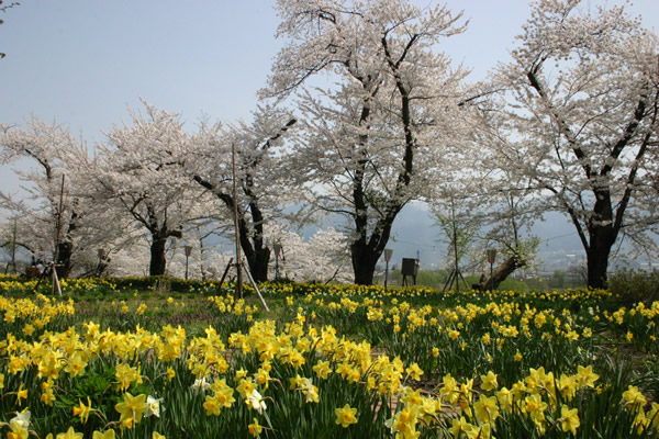 上杉謙信・景勝の二代にわたり築城された飯山城。城内には約400本のソメイヨシノが咲き乱れる。同時期、三の丸ではスイセンの花も見頃となります。問/飯山市観光協会 0269-62-3133