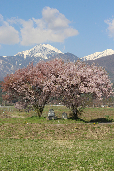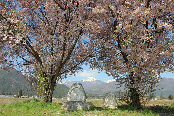 のどかな安曇野に静かに佇む道祖神。北アルプス常念岳をバックに、寄り添うような樹形が美しい2本の桜と道祖神は、春の安曇野を象徴するような牧歌的な風景。カメラマンの格好の被写体となっています。