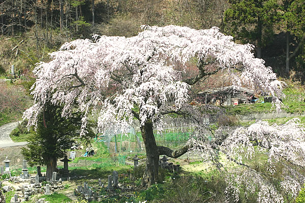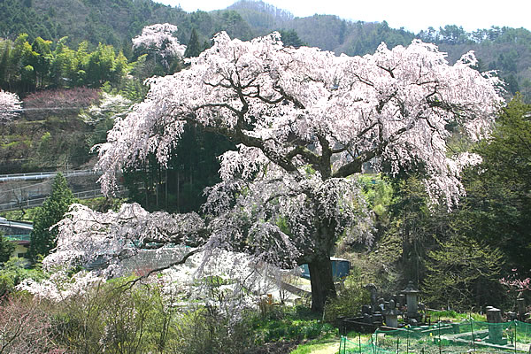 長野県下伊那郡清内路村R256沿いの渓谷、周囲を圧倒するかのように咲く見事な一本桜。江戸時代ペリー来航時に植えられた「しだれ桜」で、通称黒船桜と呼ばれる。枝振りが良く一本の木とは思えない花をつけます。桜の脇を通る山道は、戦国街道と呼ばれ当時の面影や数多い伝説が語り継がれている。村指定天然念記念物。中央道飯田ICより30分、園原ICより10分