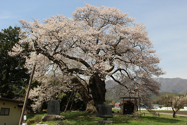 樹齢約1,000年、長野県指定天然記念物のエドヒガンザクラ。樹高約13m周囲6.7mで、長野県内でも有数の大樹。 木の下に小さな祝殿があり、権現様が祀られているところから権現桜と呼ばれ、古くより地元民に親しまれています。