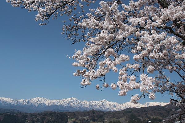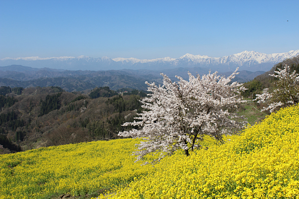 北アルプスを望む中条の「アルプス展望広場」。菜の花畑と桜、残雪の北アルプスは、一幅の絵画を見ているような美しい風景。(長野市中条・アルプス展望広場)マップ