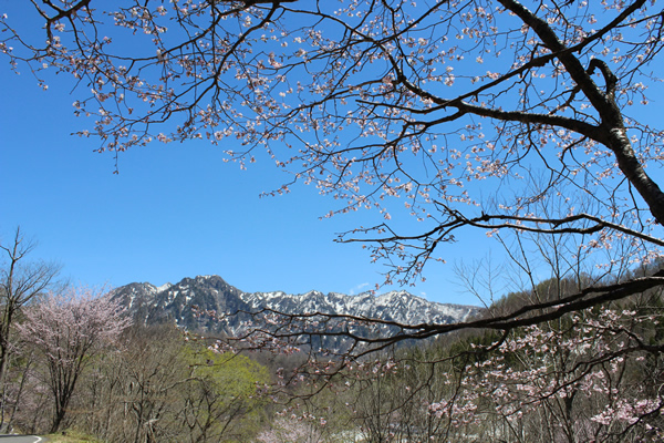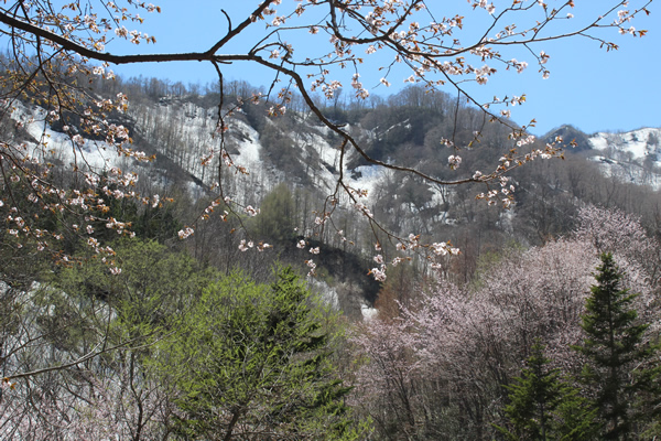 日本一の水芭蕉群生地で知られる奥裾花自然園のある奥裾花渓谷。 雪解けの時期、水芭蕉の開花期と同時に咲く山桜。 残雪、新緑、ピンク色の山桜。渓谷は淡い春の色で彩られます。