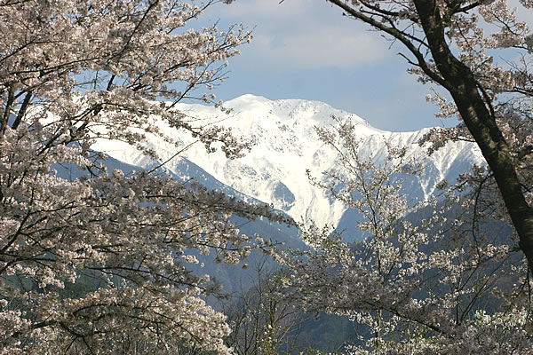 残雪の南アルプス赤石岳と桜 (大鹿村大西公園 4月中旬〜下旬)