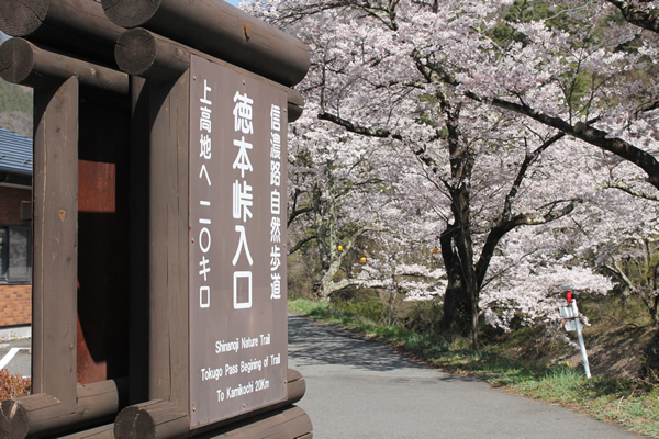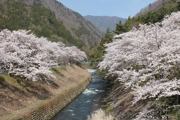 松本市より上高地、奥飛騨へと延びるR158。梓川渓谷の一角、 北アルプス徳本峠を経て上高地に至る登山ルートの入口、島々谷川沿いに咲く桜。 澄んだ渓流と淡いピンクの桜の爽やかな風景が広がります。