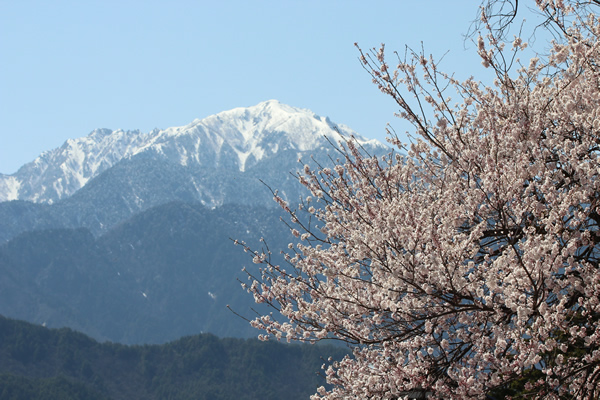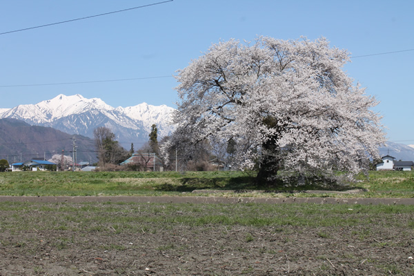 安曇野大町市常盤地区の須沼にある一本桜。北アルプス餓鬼岳、爺ヶ岳、鹿島槍ヶ岳、五竜岳と桜が一緒に楽しめます。地元では「田打ち桜」と呼ばれ、農作業の目安となる役目を果たした桜です。