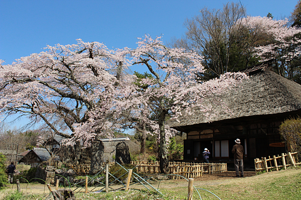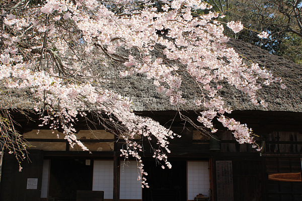 標高960メートル、八ヶ岳を背に南アルプスを望む富士見町境の高台に佇む、樹齢推定250年、町指定天然記念物のしだれ桜。茅葺き屋根の観音堂と古木の風貌がよくマッチし、カメラマンに人気のスポットとなっている。