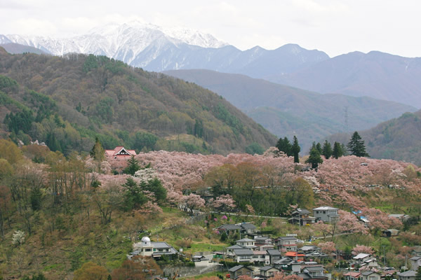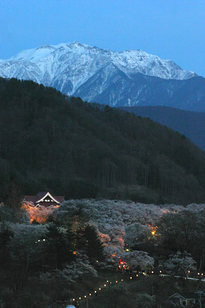 「天下第一の桜」と呼ばれる全国屈指の桜の名所、信州伊那「高遠城址公園」。南アルプス仙丈ヶ岳を背景に、約1,500本のタカトウコヒガンザクラが公園一帯を埋め尽くす様は圧巻。暮れなずむ里山の桜景色も趣があります。