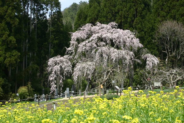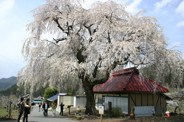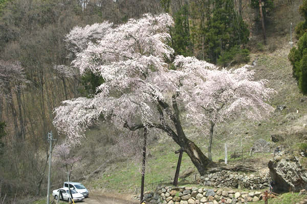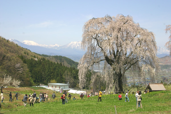 残雪の北信五岳、黒姫山や飯綱山、戸隠、妙高山を望む村の高台、天を突くような見事なしだれ桜。樹齢250年、幹周約4m、樹高約22m、樹冠経約12mの勢いのある大樹。映画「北の零年」のロケの舞台にもなっている。
