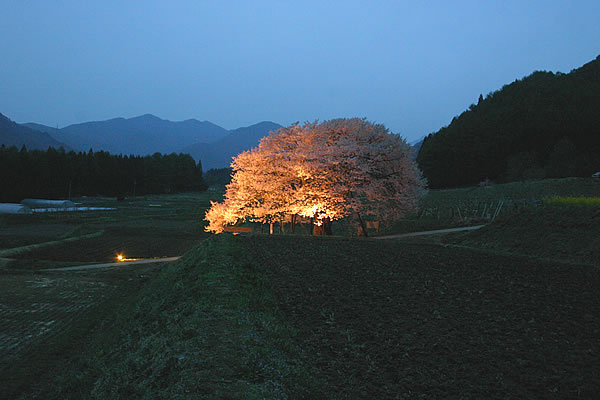 高山村黒部の山あいの水田地帯の独立樹。幹周約7m、樹高約13m、樹冠15mのエドヒガンザクラ。花は赤みが濃く、夜間にはライトアップされ幻想的な雰囲気を醸し出している。写真マニアにも格好の被写体。